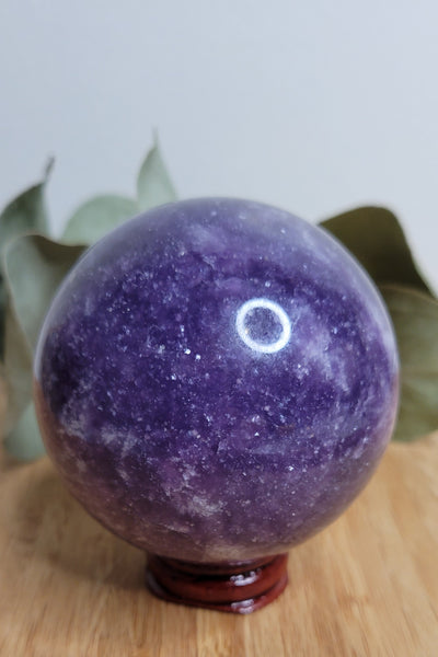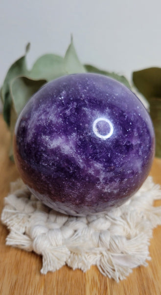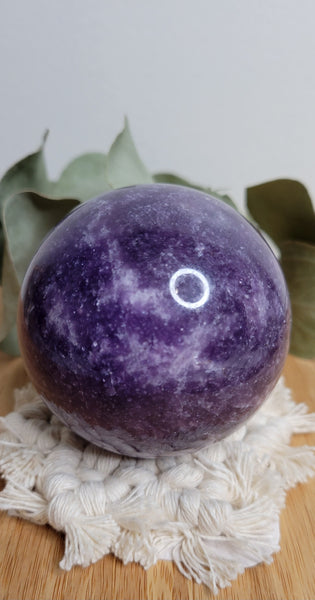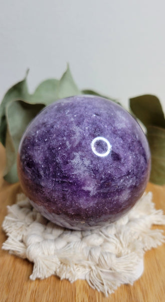 3 inch diameter. 405 grams. Macrame sphere holder sold separately. Sphere comes with small wooden stand